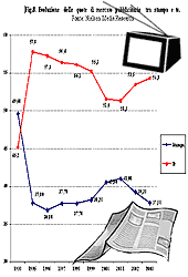 Su quest'ultimo dato Luca Cordero di Montezemolo ha fissato la sua attenzione sottolineando come la televisione italiana, in virtð di un sistema dei media che la favorisce rispetto agli strumenti di comunicazione, possa godere di una quantitö sempre crescente di investimenti pubblicitari (54,7% nell'ultimo anno contro il 37,8 destinato alla carta stampata). "Sia ben chiaro", ha detto il presidente della Fieg," noi grandi amanti dei giornali cosÒ come lo siamo dei libri, ma non siamo contrari ad una televisione moderna e, auspichiamo, di qualitö", ma di fronte alla legge Gasparri che ² destinata ad aggravare ulteriormente il divario tra tv e stampa, "si tratta solo di trovare dei giusti equilibri".